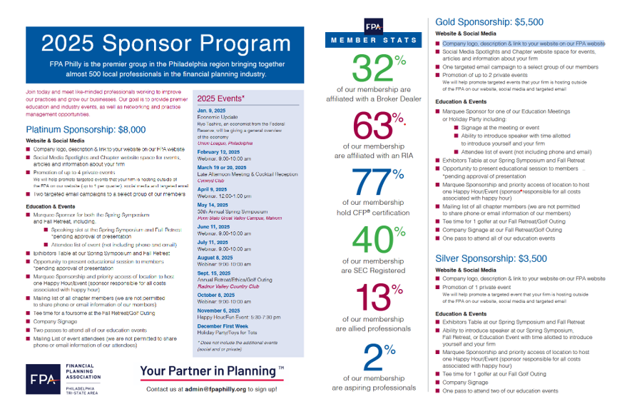 - We will help promote targeted events that your firm is hosting outside of the FPA on our website (up to 1 per quarter), social media, and targeted email